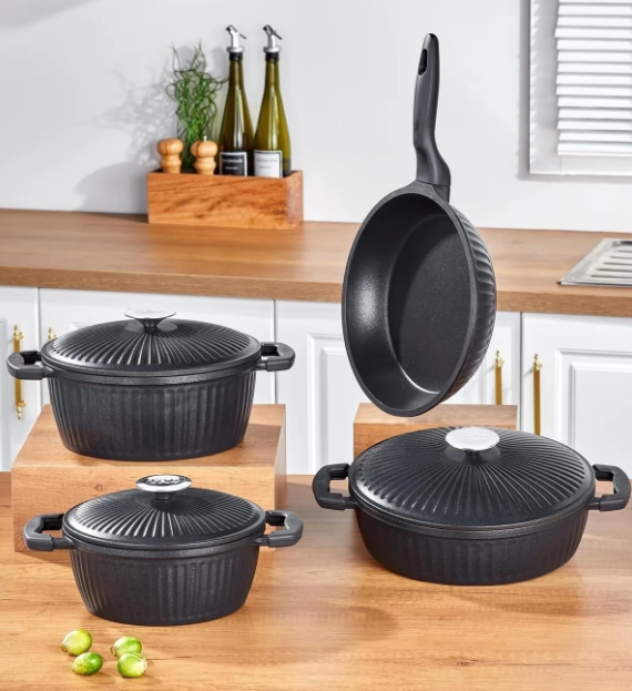 Taç Valeriya 4’lü 7 Parça Granit Döküm Tencere Seti – Siyah